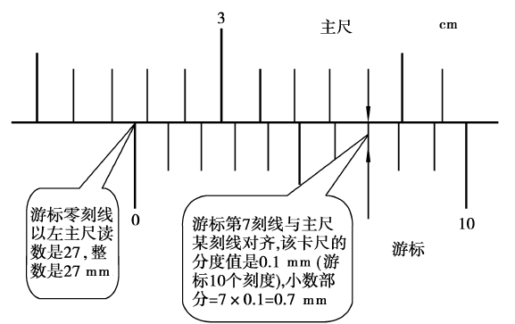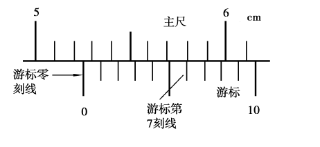在图4.8中,游标零刻线的左边,主尺的读数是52毫米;主尺某刻线与游标第7刻线最接近,小数部分是7×0.1=0.7毫米,则其读数是52+0.7=52.7毫米。