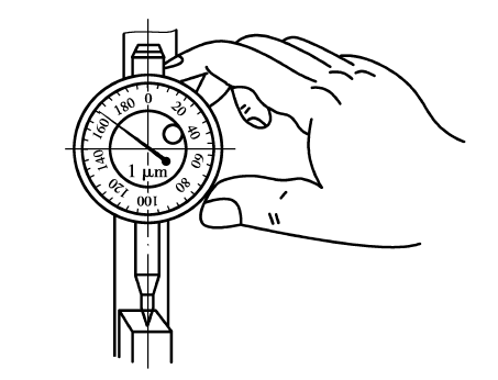 (4)测量头与被测量面接触时,测量杆应预压缩1~2毫米,调好,提压测量杆几次。百分表零位的调整方法如图4.26所示(不一定非要对准零位,根据实际情况,对准某一整刻线就行)。