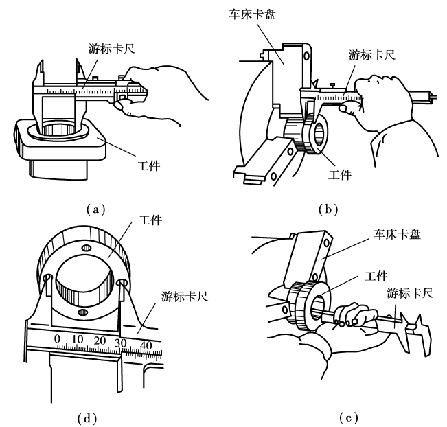 (a)测量外径(b)测量内孔深度(c)测量内径(d)测量长度