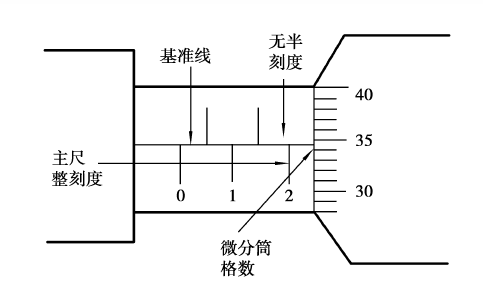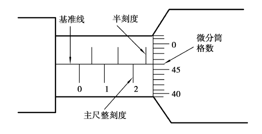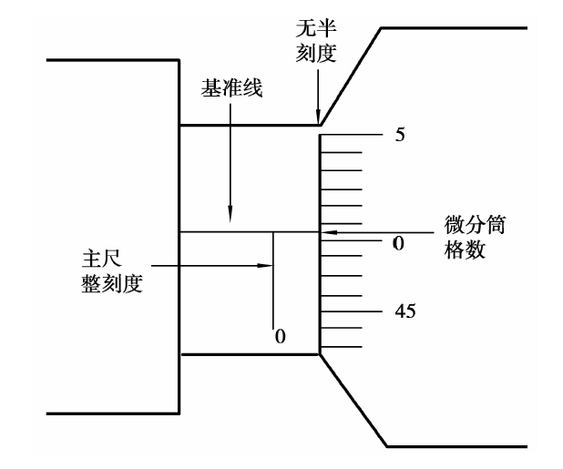 (3)微分筒读数。微分筒对准基准线的格数乘以0.01(微分筒的格数由下向上数)。如果不是刚好对准,就要估读。