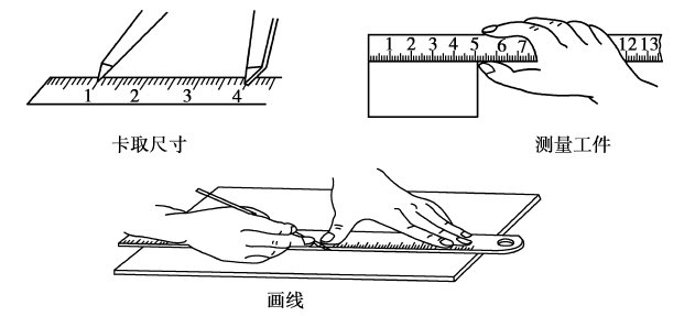 钢直尺是一种简单的量具,如图4.4所示。尺面上刻有公制或英制两种,公制钢直尺的分度值是1毫米,常用规格有150毫米、200毫米、300毫米、500毫米等多种,它主要用来测量长度尺寸,也可以用做画直线时的导向工具,如图4.5所示。
