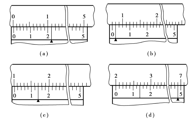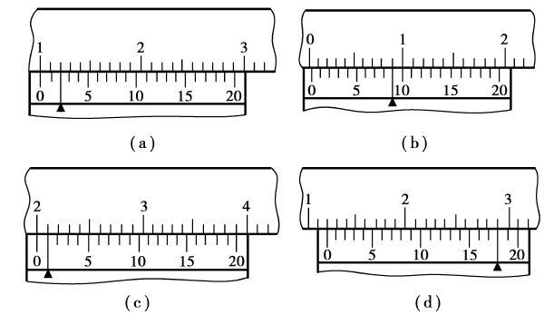 (3)分度值为0.02毫米的游标卡尺读数示例。如图4.10所示(有黑色三角形符号处的游标刻线为对齐的刻线)。图4.10(a)的读数是0.22毫米(0+0.02×11=0.22),图4.10(b)的读数是7.02毫米(7+0.02×1=7.02),图4.10(c)的读数是20.05毫米(10+0.02×7=10.14),图4.10(d)的读数是19.98毫米(19+0.02×49=19.98)。