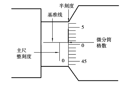 (2)半刻度。在主尺最靠近微分筒的整刻线与微分筒之间,如果出现半刻度,就加0.5毫米;如果不出现半刻度,就不加0.5毫米。