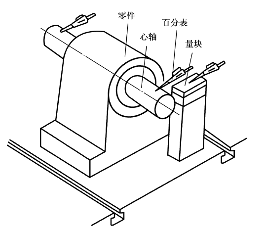 (5)测量零件孔的轴线对底面的高度及平行度,如图4.31所示。其测量结果=百分表读数+量块值-心轴半径。