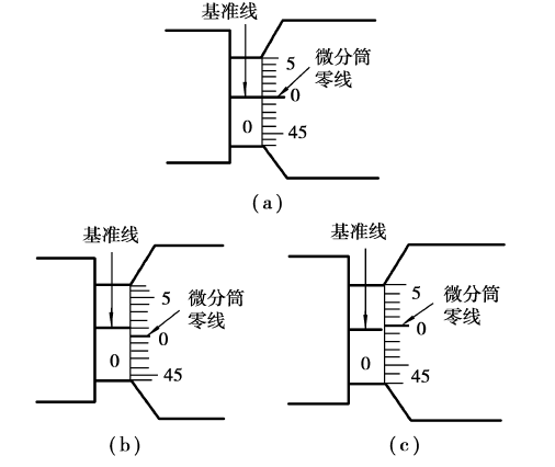 (a)基准线与微分筒零线对正(b)微分筒零线在基准线之下(c)微分筒零线在基准线之上