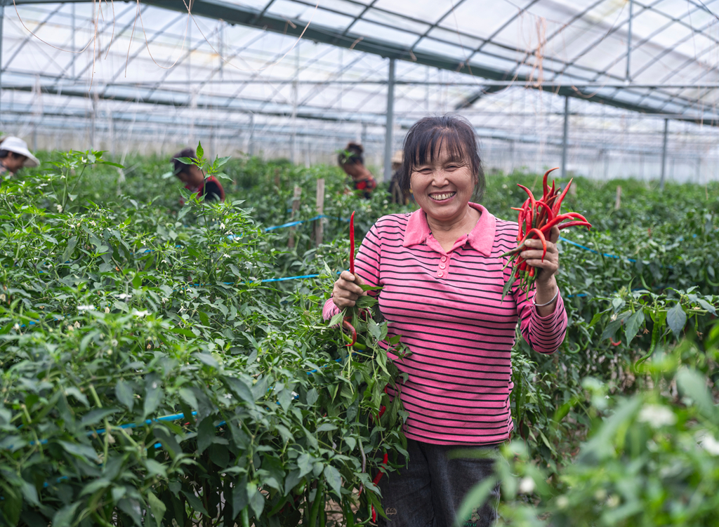 ▲五龙村蔬菜大棚内,村民正在采收辣椒。受访者供图