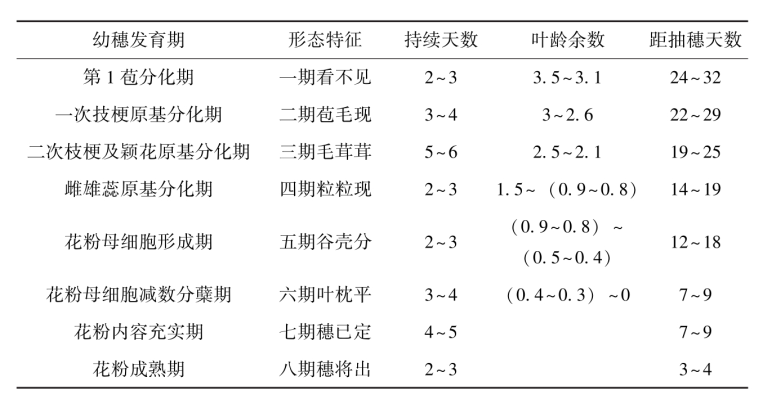 稻穗从分化开始到发育成穗,按照丁颖的划分法将其划分为8期。穗的分化进程可通过幼穗剥查法、叶龄余数法和叶耳间长法进行确定。