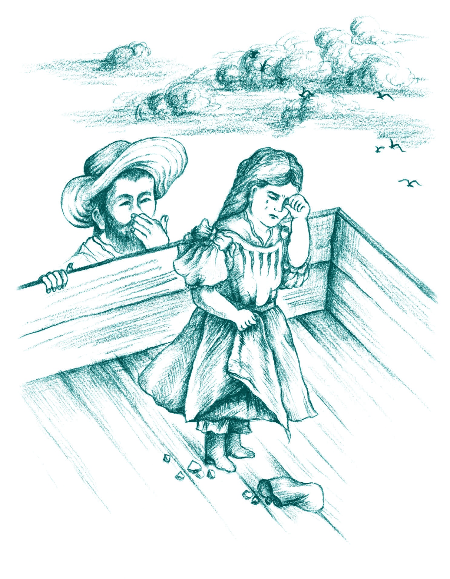 罗兰太开心了,她的口袋里装满了漂亮的小卵石。可是就在爸把她抱起来放到马车上去的时候,一件可怕的事发生了。