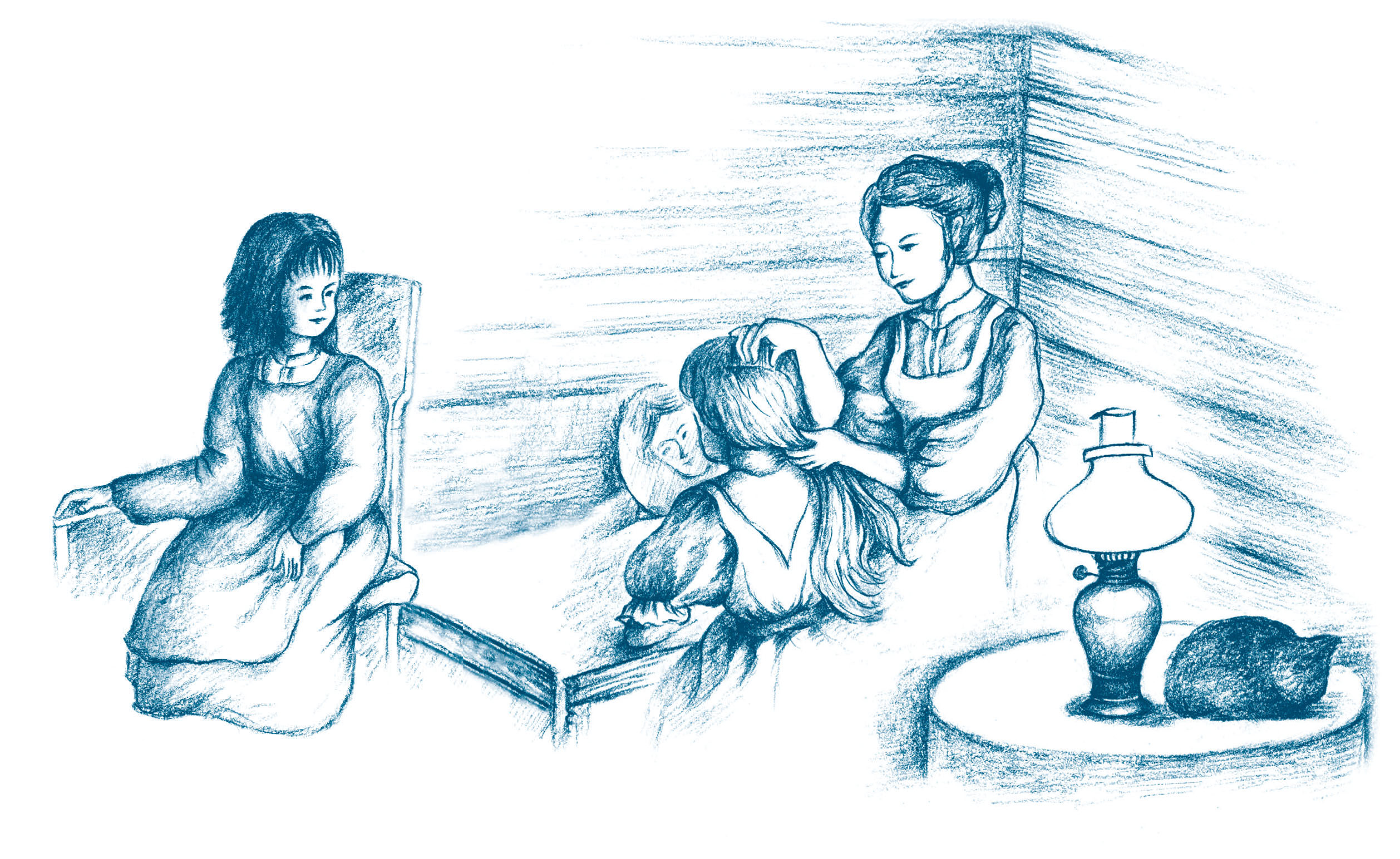 妈催着罗兰和玛丽赶快吃早餐,接着她很快就把碗盘洗好了。趁妈整理床铺的时候,她们就穿上自己的长袜和鞋子,然后妈给她们穿上最漂亮的裙子——玛丽穿的是天蓝色的印花布裙,罗兰穿的是深红色的印花布裙。玛丽帮罗兰扣好背后的纽扣,妈再帮玛丽扣好裙子。