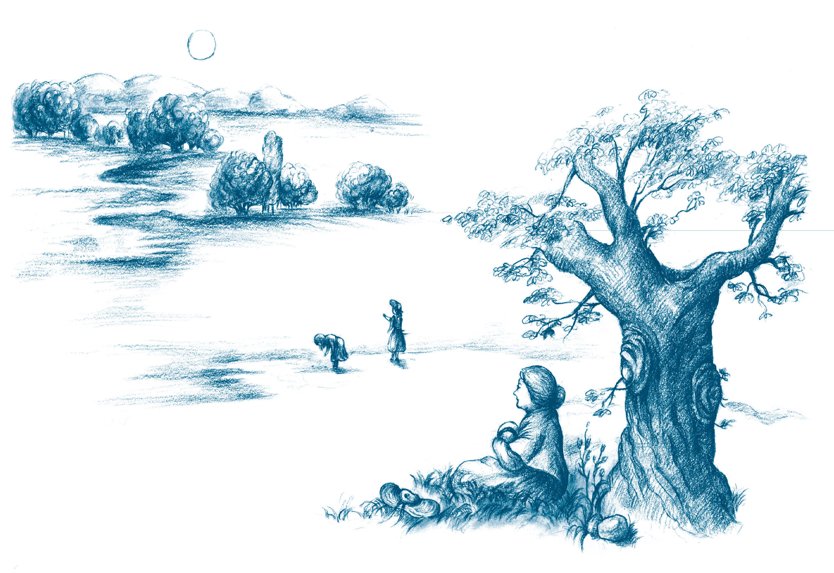 爸用坚韧的树皮做了一架秋千,挂在罗兰那棵树的一根低低的大树枝上。这是罗兰的秋千,因为它挂在她的树上,不过罗兰不可以自私,玛丽什么时候想玩就得让玛丽玩。