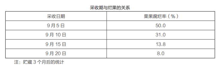 板栗完全成熟的标志是:栗苞颜色由绿变黄,再变为黄褐色,中央开裂,栗果由褐色完全变为深褐色,有光泽。果座与栗蓬自然分离,一触即落。板栗品种成熟最早的在8月下旬,大部分品种在9月中下旬成熟,最晚的在10月下旬。同一株板栗树,其栗苞成熟期也不同:树上部、外围及阳光充足部位的栗苞成熟较早,树下部及内膛成熟较晚;强壮枝上的栗果成熟较早,弱枝上的栗果成熟较晚。充分成熟的栗果有较强的抗病菌和抗不利环境的能力,耐贮性好;未充分成熟的果实含水量高,易受病菌侵害,耐贮性差。适时采收是提高栗果贮藏效果的保证。板栗坚果在成熟前15天内坚果迅速增重,愈是接近成熟,增长幅度愈大。要严格适时采收,一般来说,在栗蓬30%开裂时开始采收较适宜。下表是笔者在北京板栗产区做一个板栗采收时期与沙藏后烂果关系的试验。
