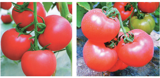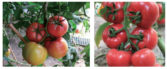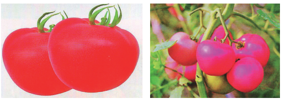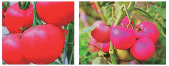 (1)双飞6号 西安双飞种业最新推出抗TY病毒粉红硬果番茄新品种。无限生长类型,长势强,叶量中大,连续坐果好,中早熟,果型高圆,单果重200~250克,深粉红,色泽靓丽,无绿肩,皮厚硬度好。抗番茄黄化曲叶病毒(图1-3)。