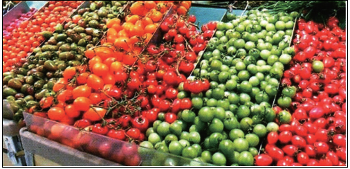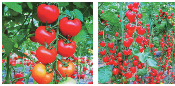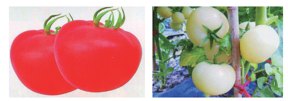 番茄果实的形状、大小、颜色、心室数及风味等因品种不同而异。成熟果实的色泽有大红、粉红、橙黄、金黄、淡黄、深红色、紫色、绿色等颜色(图1-2),由果皮和果肉的颜色相衬而表现出来。