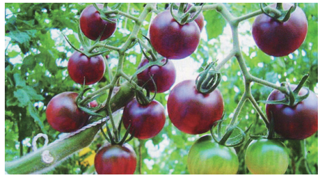 (8)黑珍珠 从德国引进的番茄品种(图1-28),该品种为一代杂交种,属无限生长类型,从定植到初次采收需60~65天;中熟,果实成熟后为紫黑色,口感好、硬度高,极耐运输;植株生长健壮,连续结果性较强,每穗结果10个左右;果实为圆球形,红黑色,单果重18~20克,口感酸甜适度,特别适合鲜食;适应性广,耐热性较好,抗叶霉病、晚疫病。该品种植株生长旺盛,不宜密植。