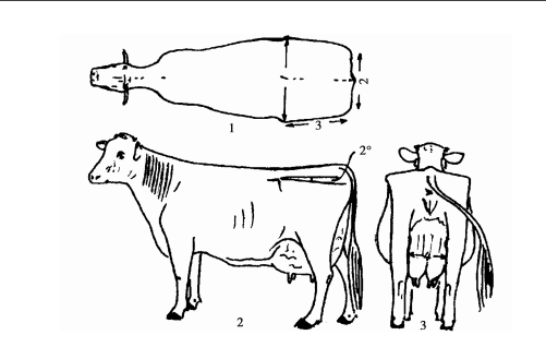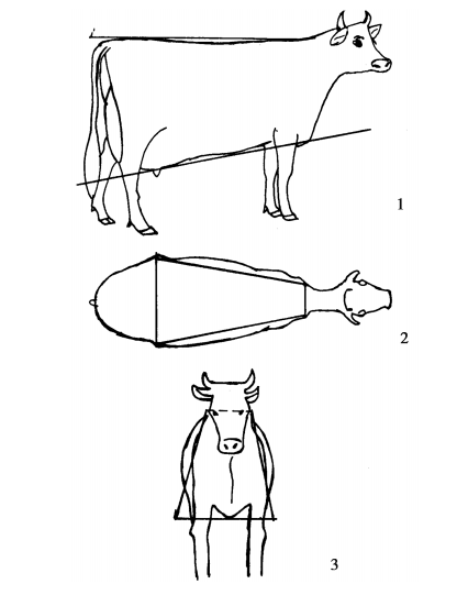 图1-1奶牛楔形模式图 1侧望2俯视3前视(黄应祥,1993)
