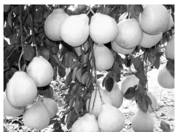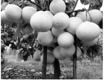 树势强健,树冠高大,开张或半开张。枝条粗壮较直立,老龄树枝条多斜生,有小刺。叶披针状椭圆形,叶缘有浅锯齿,翼叶发达呈心形,叶厚,叶面深绿,叶背浅绿色。总状花序或单生,花大。果实梨形,单果重500~1500克,成熟果外皮呈金黄色,油胞细密,中果皮白色,囊壁厚,白色,汁胞细长,平行排列,白色或虾肉色,质脆嫩少汁。果实可食率为40%~60%,果汁含量30%~40%,果汁含可溶性固形物11%~12%,每100毫升含总酸量0.3~0.6克,维生素C100~200毫克/千克,营养丰富,品质优良。果实10月下旬至11月中旬成熟,耐贮藏,经贮2~3个月后果肉变软,香蜜味浓,风味更佳。唯种子较多,每果60~120粒(图1-9)。