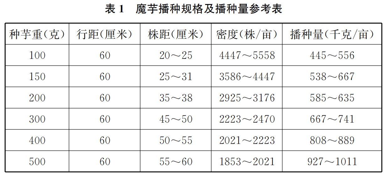 注:①表1为商品芋生产的种植规格及播种量参考值,为提高单产可适当密植,即株行距分别在上述基础上调减5厘米左右,在实际操作过程中魔芋播种密度一般依种芋球茎横径的4倍为株距,6倍为行距,以根状茎横茎的7倍和14倍为株距和行距种植。决定栽植距离时,对于向南斜坡或较低海拔处,宜密植;在高寒地区,日照较少,宜稍稀植;花魔芋生长势旺宜较稀植;白魔芋植株矮小,生长势较弱,宜较密植。
