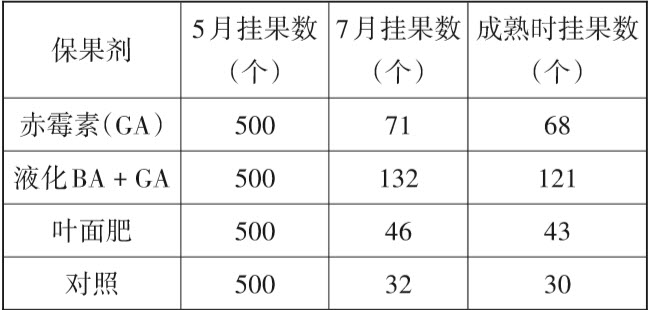 可在谢花3/4至谢花后1个月内,喷布1次~2次赤霉素、生长素、细胞分裂素等生长调节激素保花保果。赤霉素类激素:常用GA(920)效果较好;细胞分裂素类激素:常用BA效果较好;生长素类:2,4-D,浓度20毫克/升,主要防采前落果,防幼果脱落效果较差。不同激素保果试验效果见表2-5,实验证实,防止落果最有效的保果剂是“BA+GA”,即细胞分裂素加赤霉素。