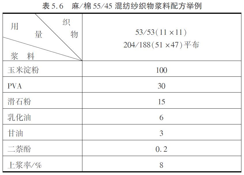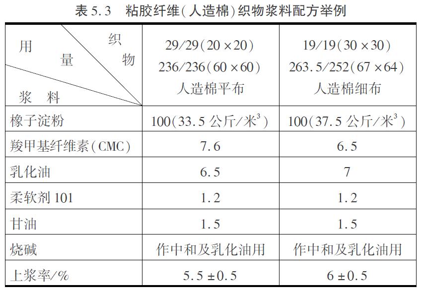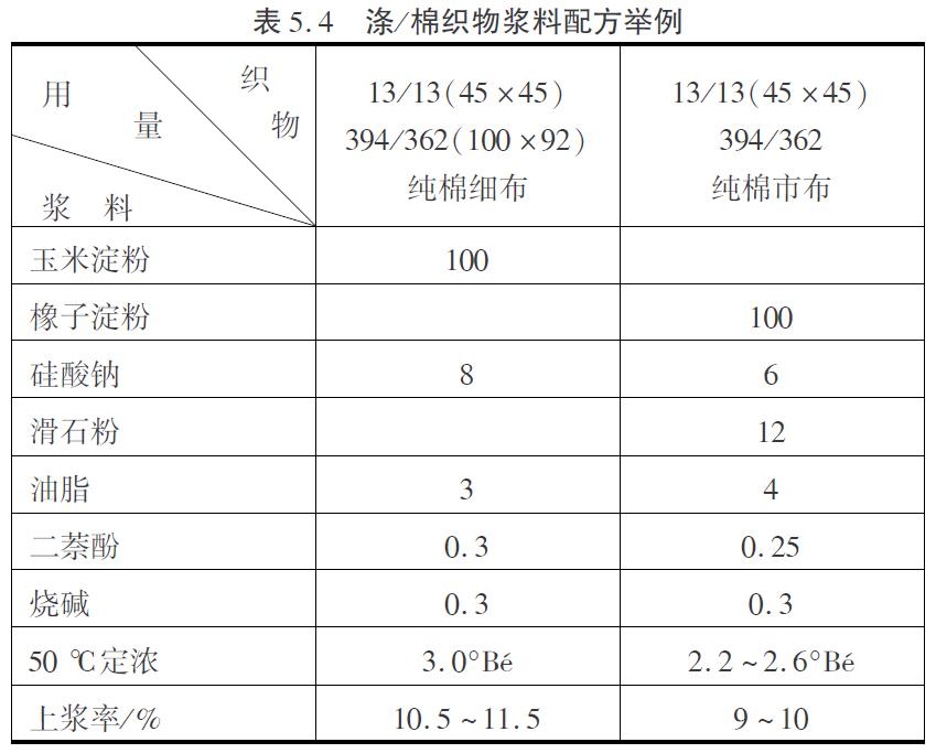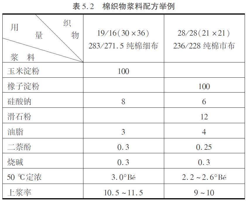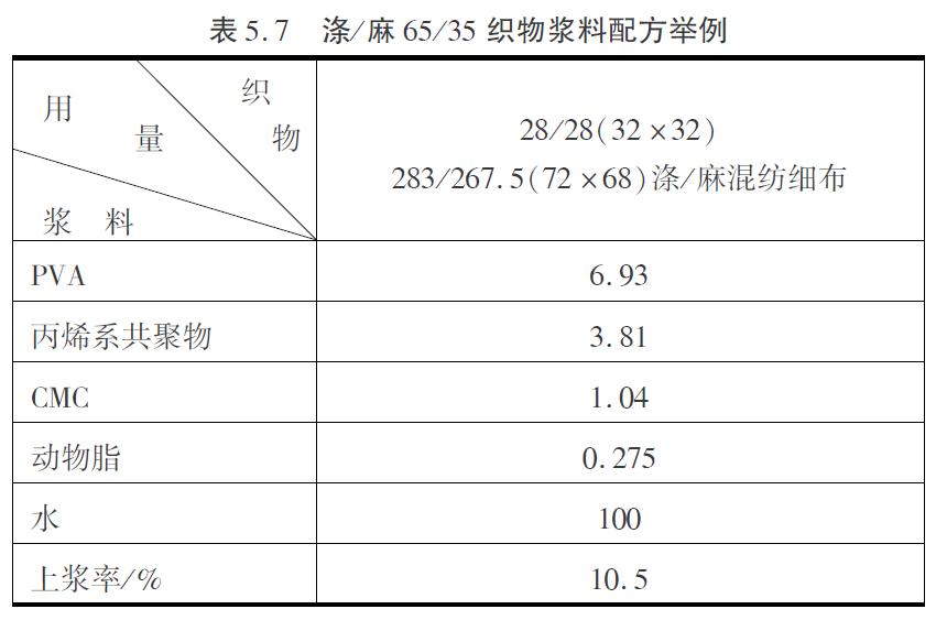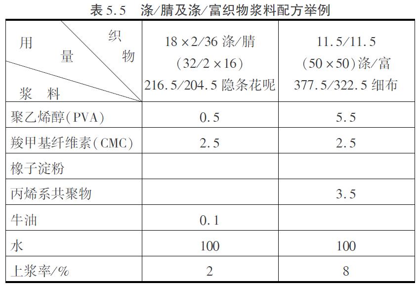 下面就几处不同纤维织物的浆料配方举例列于表5.2~表5.7,以供参考。