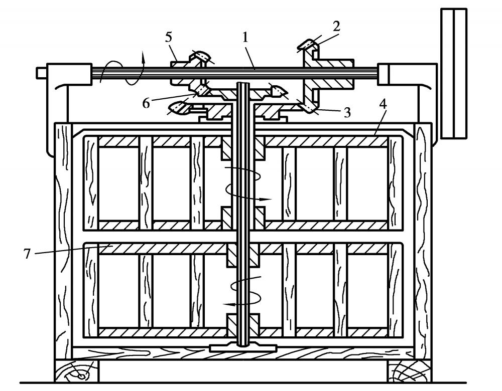 在调浆桶的横轴1上,装有大小不同的两只伞齿轮2和5,伞齿轮2与伞齿轮3啮合,传动固定在长套筒上的上搅拌扇4做反时针方向回转;伞齿5与伞齿6相啮合,传动固装在竖轴上的下搅拌扇7做顺时针方向回转,这样,能使浆液均匀混合。搅拌扇速度为20转/分。
