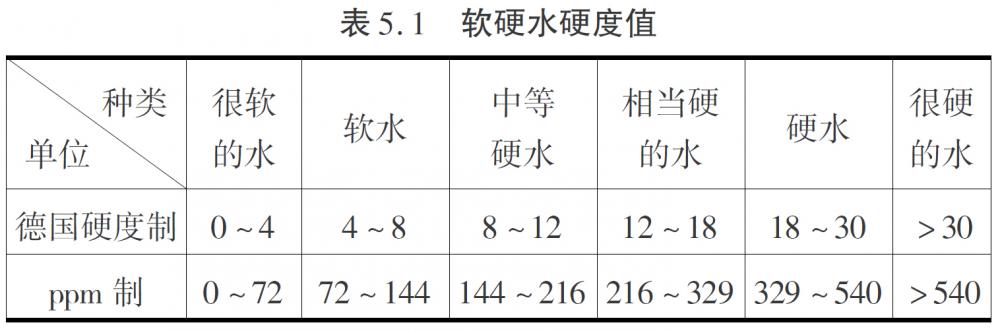 一般纺织厂调浆用水的硬度,约在德国硬度4~7之间。软硬水分类可参看表5.1。