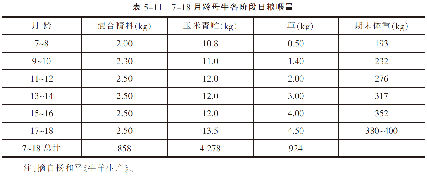 育成母牛受胎后,一般情况下仍按育成牛饲养,仅在分娩前2~3个月才需要加强营养,为胎儿发育和产后泌乳作准备。尤其是维生素A、钙和磷应充分供应。精饲料喂量可根据育成牛的体况逐渐增至4~7kg,以适应产后大量喂精料的需要。育成牛各阶段具体喂量见表5-11。
