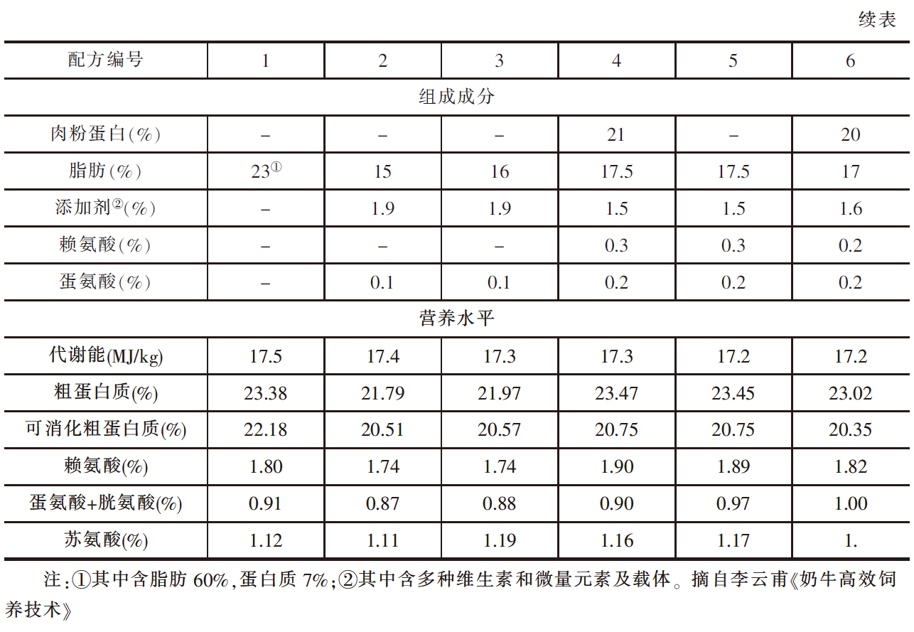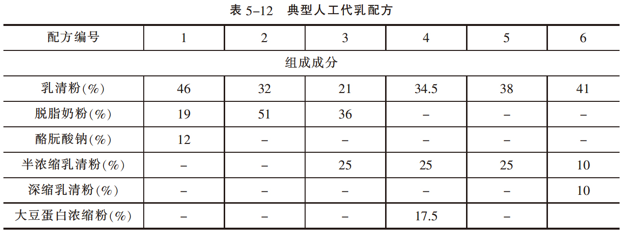 人工代乳有与常乳近似的高营养价值。主要成分是脱脂奶粉和动物脂肪,并配以微量元素和维生素。它的营养价值决定于脱脂奶粉的品质及其加工方法。近年来由于其中部分乳蛋白被大豆蛋白浓缩物和经过处理的大豆粉所代替,其效果与乳蛋白完全一样。它的蛋白质含量≥21%。人工代乳与代乳料的区别,除营养价值不同外,前者用温水冲匀后喂牛,而后者是固体状态直接采食,典型的人工乳配方见表5-12。