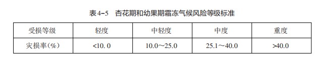 根据自然灾害风险分析原理(国家科委、国家计委、国家经贸委自然灾害综合研究组,1998年)和灾损率定出花期和幼果期霜冻气候风险等级划分标准(如表4-5所示),并按此标准把新疆杏产区划分为4个气候风险区。