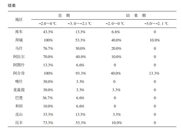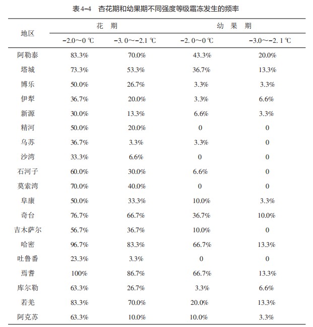 按上述指标对新疆31个县(市)气象资料(1971—2000年)进行统计,考虑到南、北疆各地杏的花期和幼果形成期时间不一致,对南疆的花期按3月21日—4月10日、幼果形成期按4月11—30日统计;北疆的花期按4月21—30日、幼果形成期按5月1—20日统计。计算方法:不同霜冻等级指标在各时段内出现一次记为一年次,年内出现多次不重复计算,由此统计出各地杏花期和幼果期不同强度等级霜冻发生的频率(如表4-4所示)。