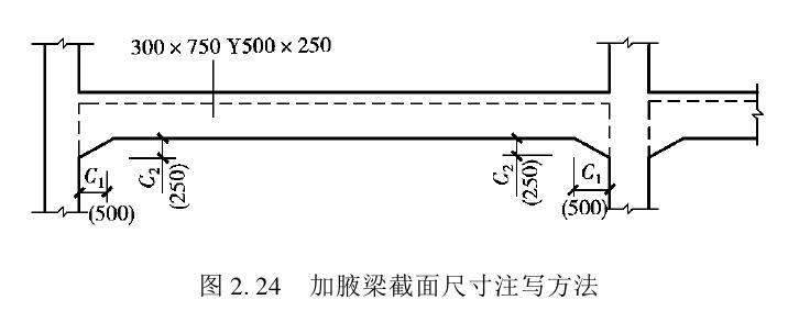 ②梁断面尺寸,当为等断面梁时,用b×h表示,300×650表示这根梁宽300mm,高650mm。当为加腋梁时,用b×hYC1×C2表示,其中C1为腋长,C2为腋高,如图2.24所示。