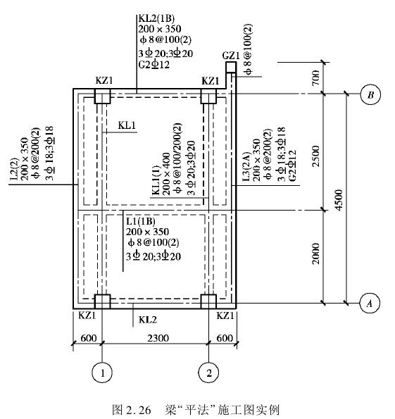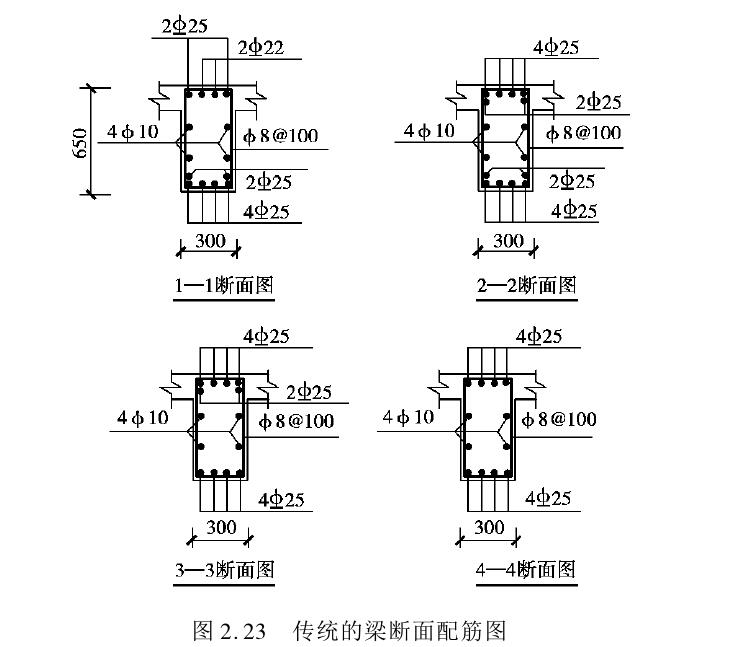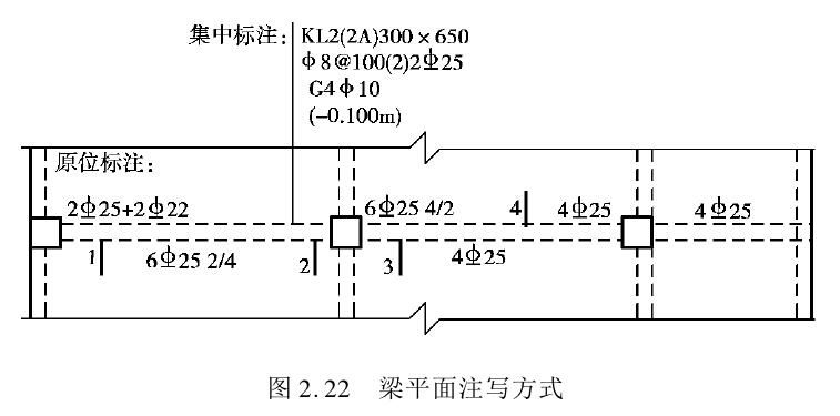 平面注写方式,系在梁平面布置图上,分别在不同编号的梁中各选一根梁,在其上注写断面尺寸和配筋的具体数值,如图2.22所示,而不需要再画出如图2.23所示传统的梁断面配筋图。