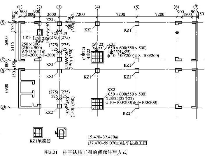 ②断面注写方式:断面注写方式省去柱表,在柱平面布置图上同一编号的柱中选择一个,画出其断面简图,直接在断面边上标注断面尺寸和配筋的数量。柱断面图采用放大的比例绘制,如图2.21所示,以便表达其尺寸和标注配筋。如KZ1断面图旁注有650mm×600mm(550mm×500mm),说明在标高19.470~37.470m范围内,KZ1的断面尺寸为650mm×600mm,括号内数字对应的是图名中带括号的标高(37.470~59.070m)柱的断面尺寸,说明在这个范围内,柱断面尺寸为550mm×500mm。同理,在其他的尺寸标注和配筋说明中,均有带括号的数字,对应的也是带括号的标高范围内柱的尺寸。