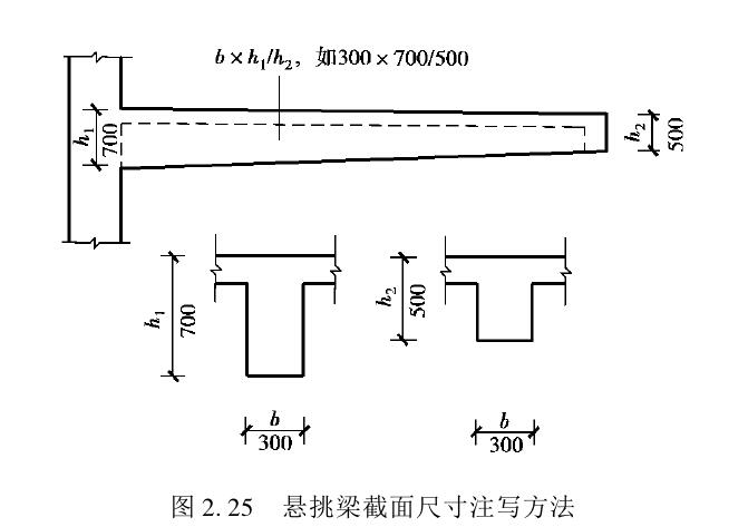 当为悬挑梁且根部和端部高度不同时,用斜线分割根部与端部的高度,即为b×h1/h2,其中h1为根部高度,h2为端部高度,如图2.25所示。