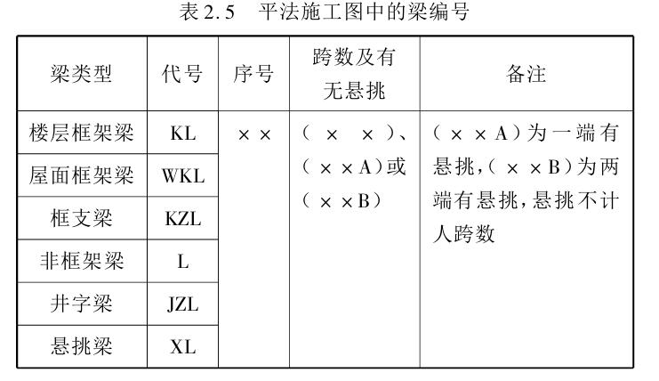 ①梁编号由梁类型代号、序号、跨数及有无悬挑的代号几项组成,其含义见表2.5。如DL2(3A)表示该梁为框架梁,序号为2,共有3跨,且一端带有悬挑。