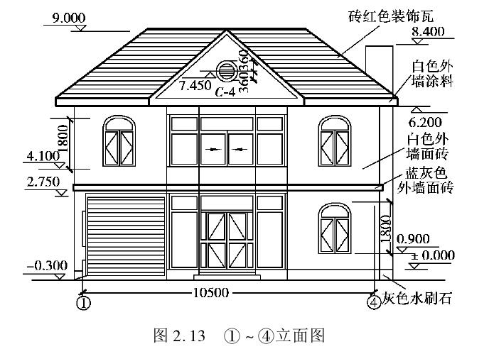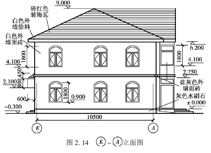 立面图是建筑物的侧视图,它反映建筑物的立面外貌,如图2.13和图2.14所示。