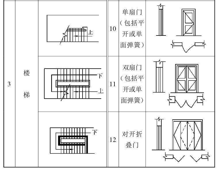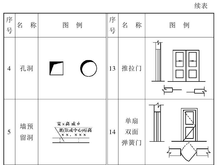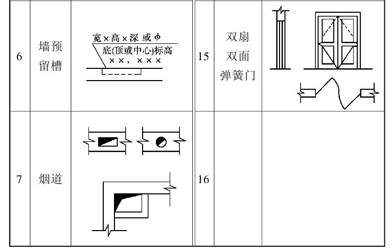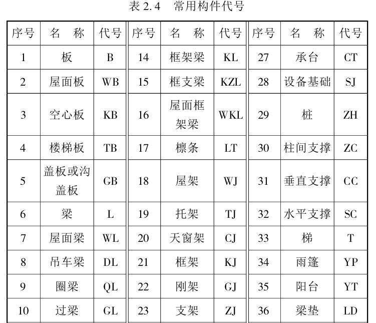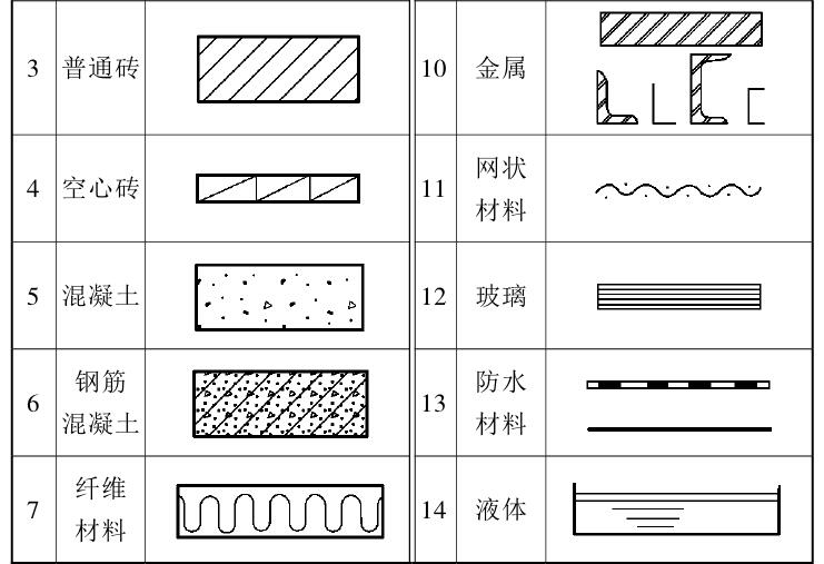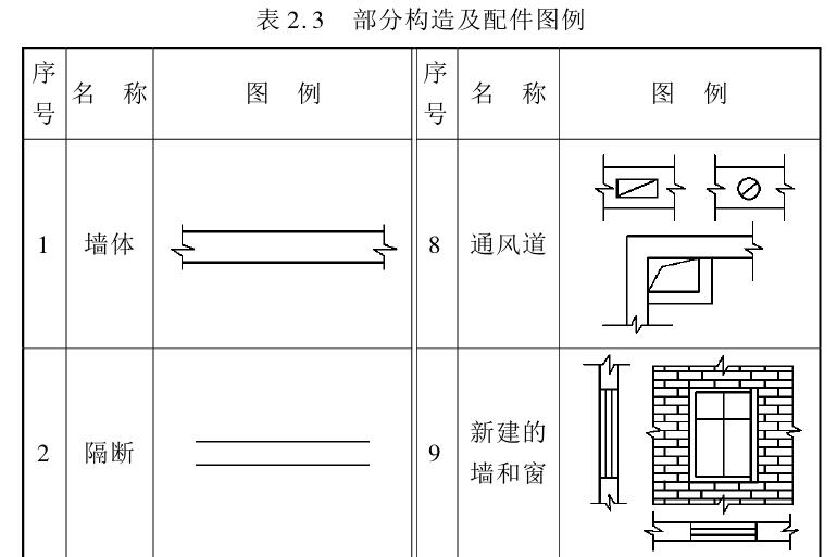 常用建筑材料图例、部分构造及配件图例见表2.2和表2.3,常用构件代号见表2.4。