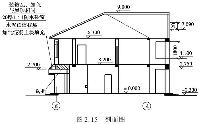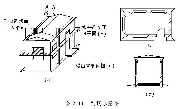 剖面图是假想用一个垂直的平面将建筑物或构件剖切,移去前面一部分,对后面一部分作正投影而得到的视图,如图2.11(c)和图2.15所示。