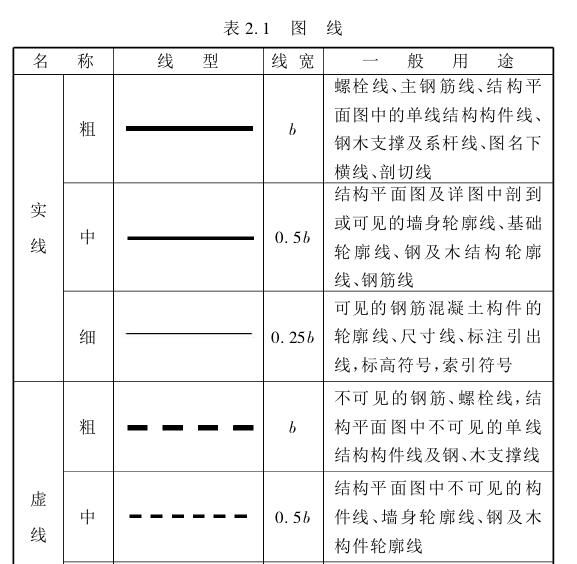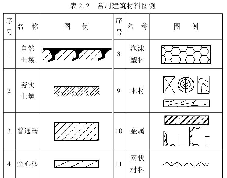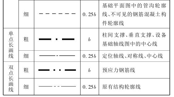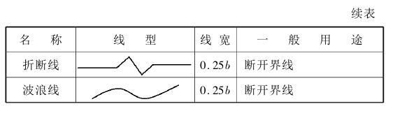 在建筑工程图中为了分清主次,绘图时必须用不同线型和不同线宽的图线绘制。表2.1是建筑、结构施工图中常用的线型。