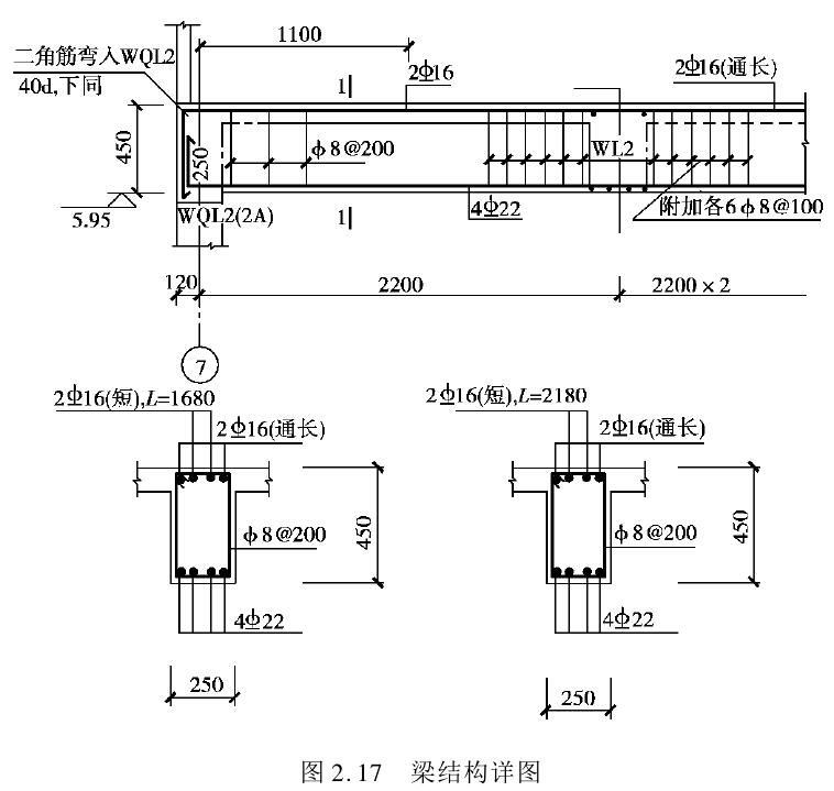 钢筋混凝土构件有定型构件和非定型构件两种。定型构件(包括预制和现浇)可以直接查阅标准图集或通用图集,不需要绘制详图。非定型构件必须绘制详图。一般钢筋混凝土梁、柱、楼梯等现浇构件都需要绘制详图。构件的结构详图如图2.17所示。