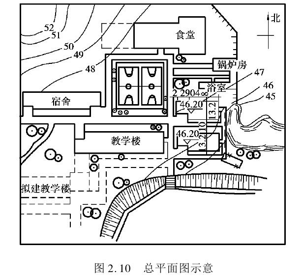 建筑总平面图是对新建筑物所在地区作水平正投影而形成的,即在地形图上把原有的建筑物、新建的建筑物,以及原有及拟建的道路、地上和地下管线、绿化等内容,按与地形图相同的比例画出来的平面图,如图2.10所示。