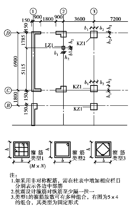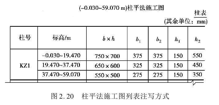 ①列表注写方式:列表注写方式采用结构层高表和柱表表示柱的尺寸及配筋。在柱平面布置图上,分别在同一编号的柱中选择一个(有时需要选择几个)截面标注几何参数代号,在柱表中注写柱号、柱段起止标高、几何尺寸(含柱截面对轴线的偏心情况)与配筋的具体数值,并配以各种柱截面形状及其箍筋类型图,从而构成柱平法施工图,如图2.20所示。