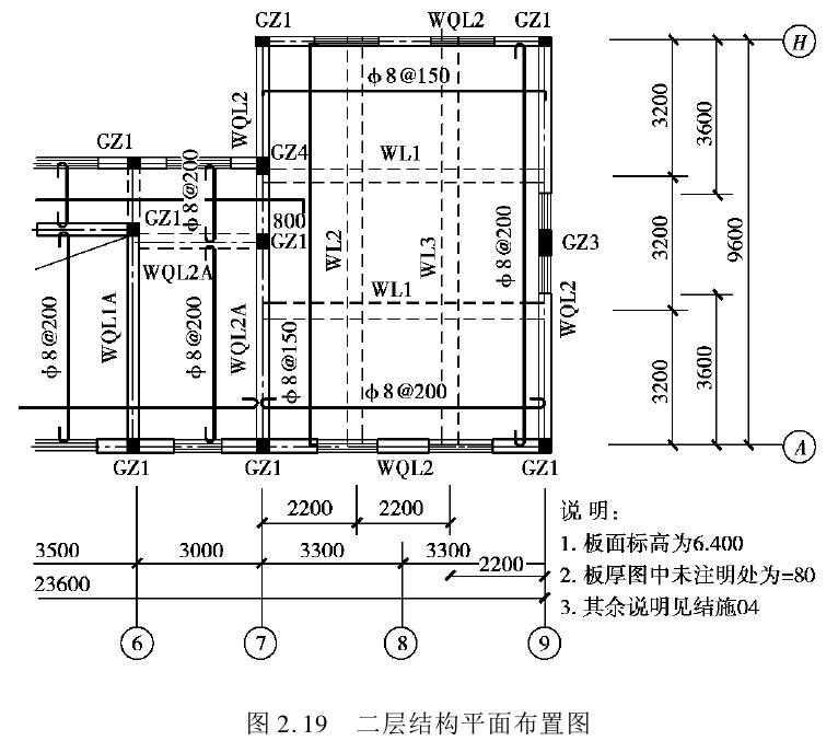 结构平面图主要表达楼面、屋面、梁、柱、墙等承重构件的平面布置,并重点表达该层楼板的结构布置形式和相关墙的平面位置。楼层的施工方式有现场浇筑和安装预制板两种,目前较多选用的施工方式是现浇。结构平面图如图2.19所示,其主要内容有以下几方面: