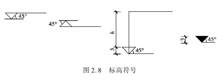 (2)相对标高 相对标高亦称建筑标高,是以所建房屋的首层室内地面的高度作为零点(写作±0.000)计算该房屋与它的相对高差,此高差即称为相对标高。比零点高的部位的标高称为正标高,比零点低的部位的标高称为负标高。正标高不必在数字前加“+”号,负标高要在数字前加“-”号。标高符号见图2.8。