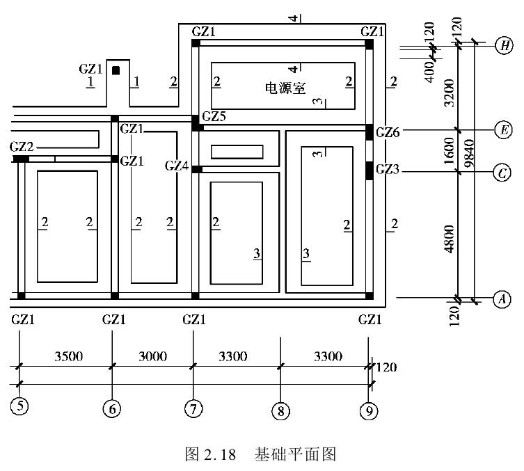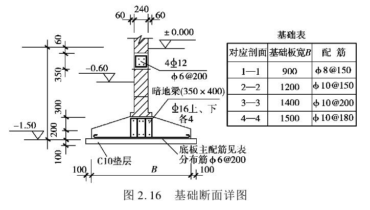 基础平面图是假想用一个水平面沿着地面剖切整幢房屋,移去上部房屋和基础上的泥土,用正投影法绘制的水平投影图。在基础平面图上,画有剖切符号并注明断面编号。断面编号一般都用阿拉伯数字连续编号。基础各部分的断面形状、材料、构造做法(如垫层、防潮层等)及细部尺寸和埋置深度都在基础详图中表示。图2.18和图2.16分别为基础平面图和基础断面详图。