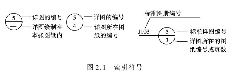 (1)索引符号 施工图某一局部或构件如需另画详图,应以索引符号索引,如图2.1和图2.2所示。