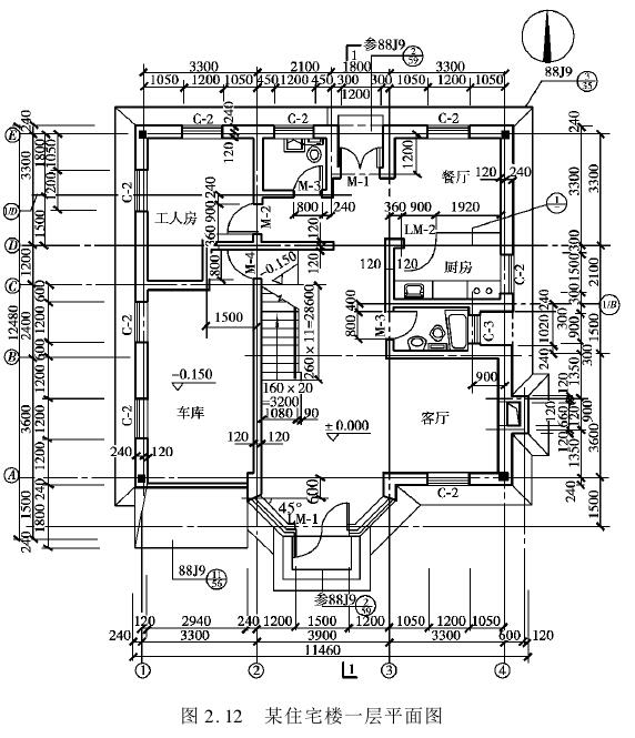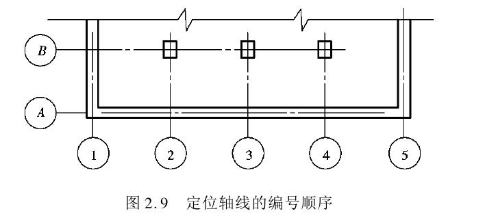 定位轴线是用来确定房屋主要结构或构件的位置及尺寸的。平面图上定位轴线的编号横向用阿拉伯数字从左至右顺序编写,纵向轴线编号用大写拉丁字母从下而上顺序编写,如图2.9所示。