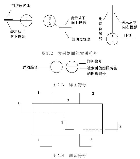 (3)剖切符号 剖切符号由剖切位置线及剖视方向组成,用粗实线绘制,编号编写在剖视方向的端部,如图2.4所示。
