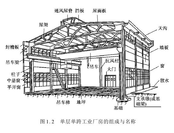 单层厂房的结构组成有两种,即墙承重结构和骨架承重结构。图1.2为单层单跨工业厂房的组成与名称。