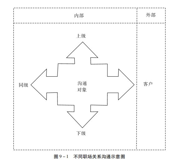 职场沟通应是最重要的沟通内容之一。这里,是人们建功立业的战场,是展现人生才华、实现自我理想的舞台。职场沟通,对内是重点处理好对上、对下、对同级的沟通,对外是做好与客户的沟通。如图9-1所示: