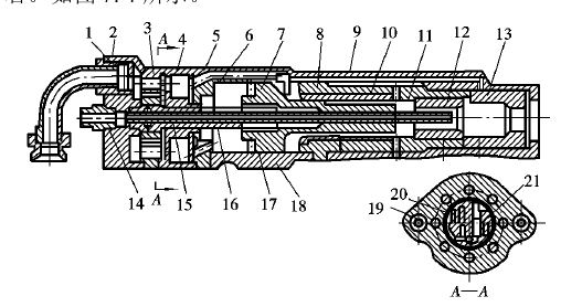 1—柄体;2—风管弯头;3—内棘轮;4—阀体;5—阀;6—阀盖;7—活塞;8—导向套;9—机头;10—花键母;11—转动套;12—钎套;13—掐套;14—水管接头;15—水针;16—螺旋棒;17—螺旋母;18—气缸;19—柱塞;20—弹簧;21—回转爪